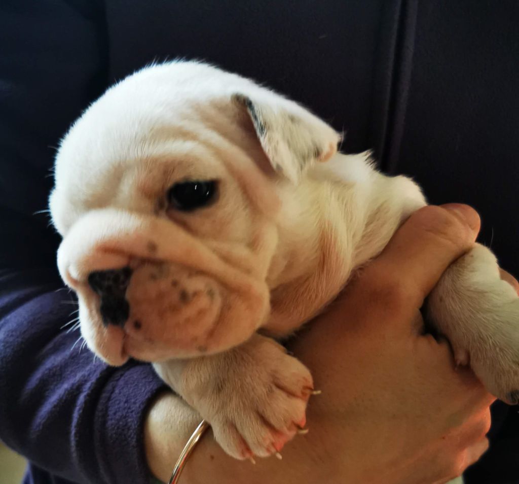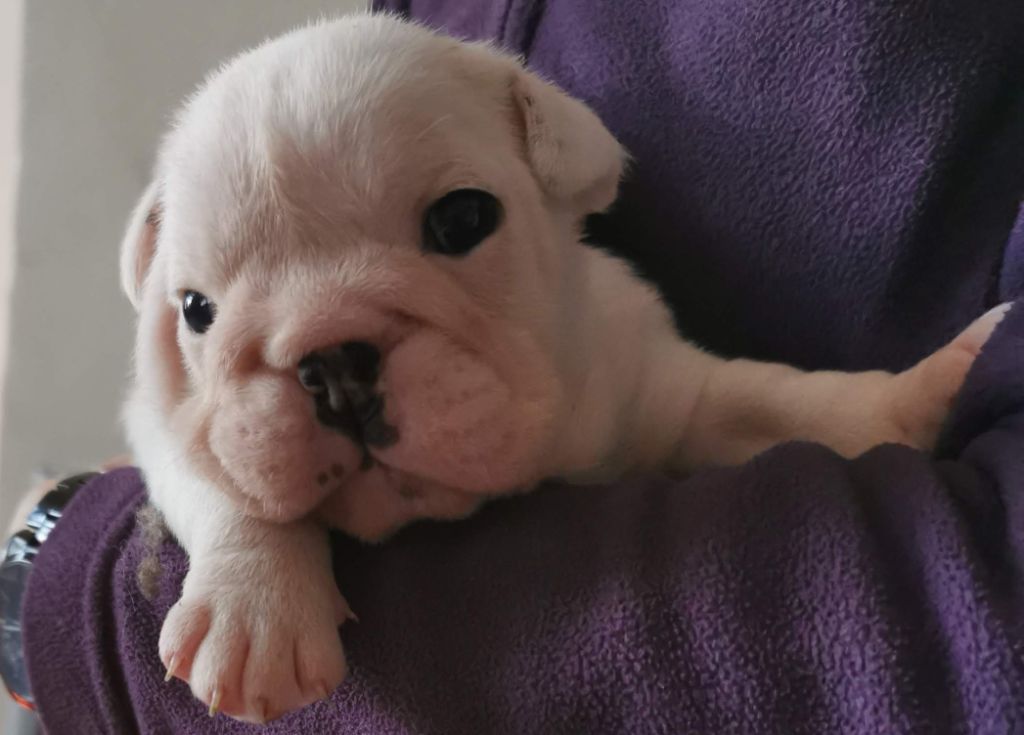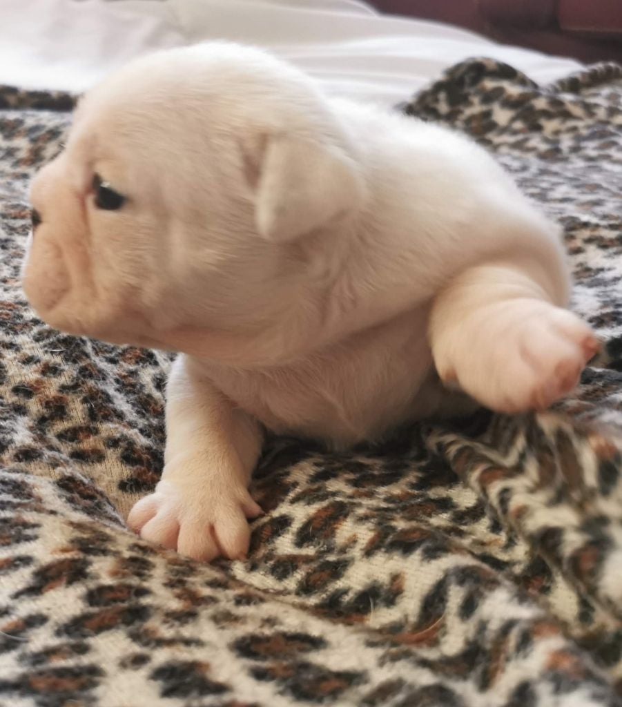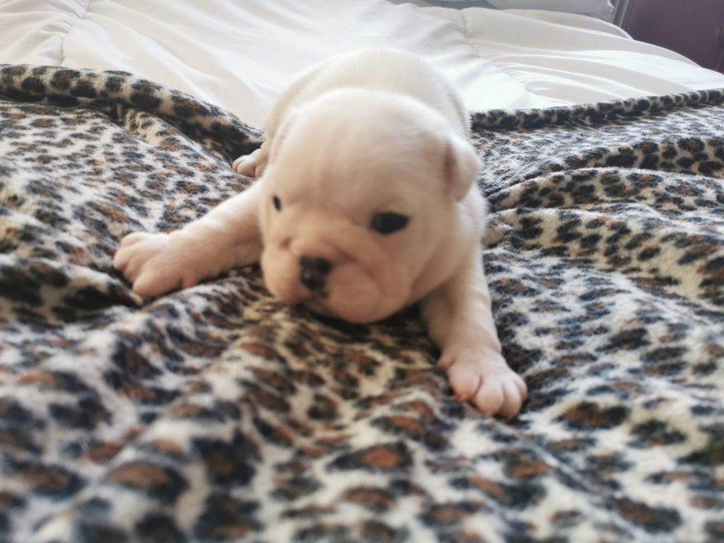 Magnifique mâle blanc avec une tâche brune sur la tête et la moitié de la queue noir. Gros gabarit . Poids de naissance 514g